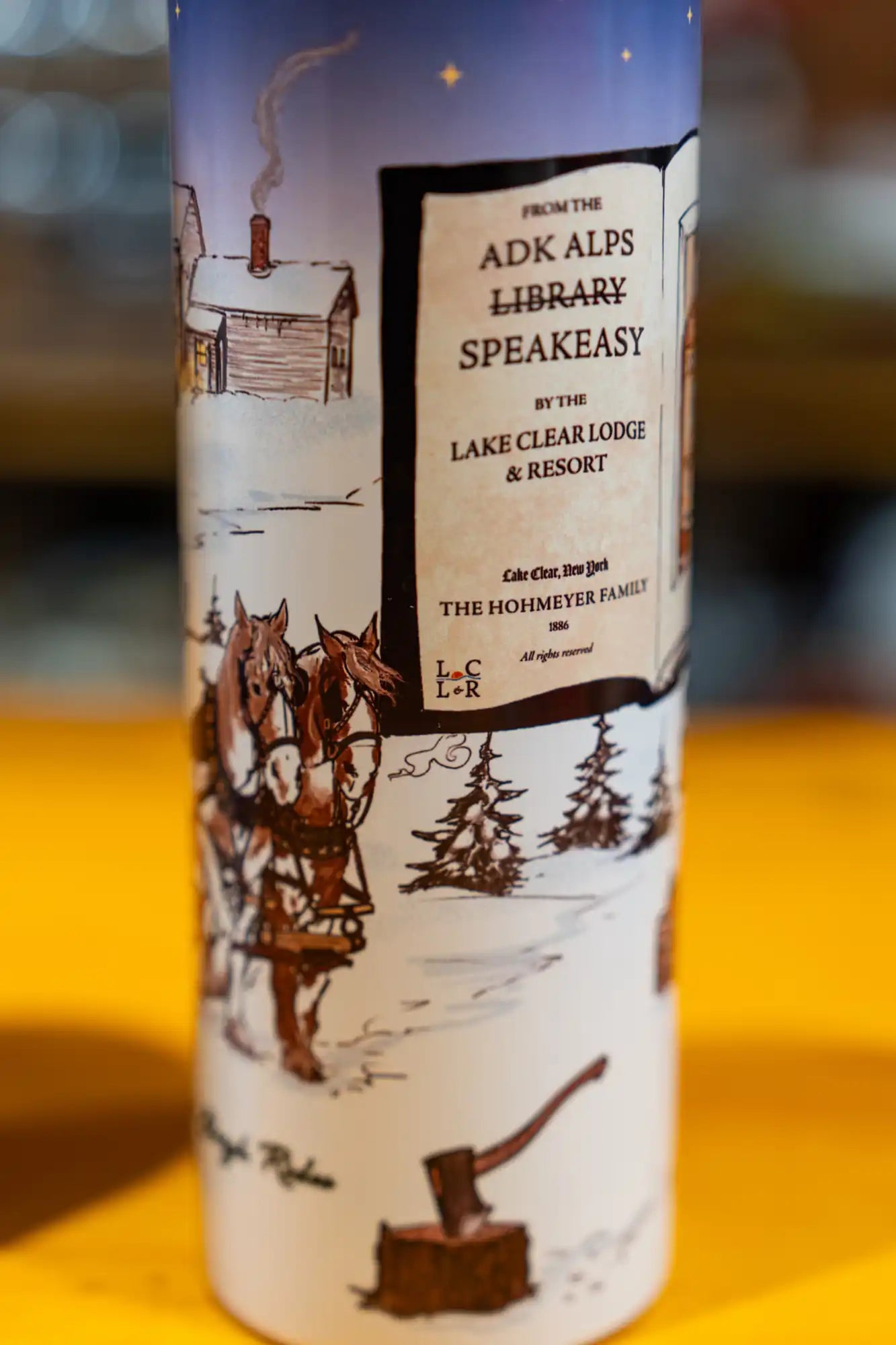 This handcrafted, insulated stainless steel tumbler keeps your beverages hot or cold and features unique Lake Clear Lodge Speakeasy & Lucky Clover Sleigh Rides hand-drawn artwork!