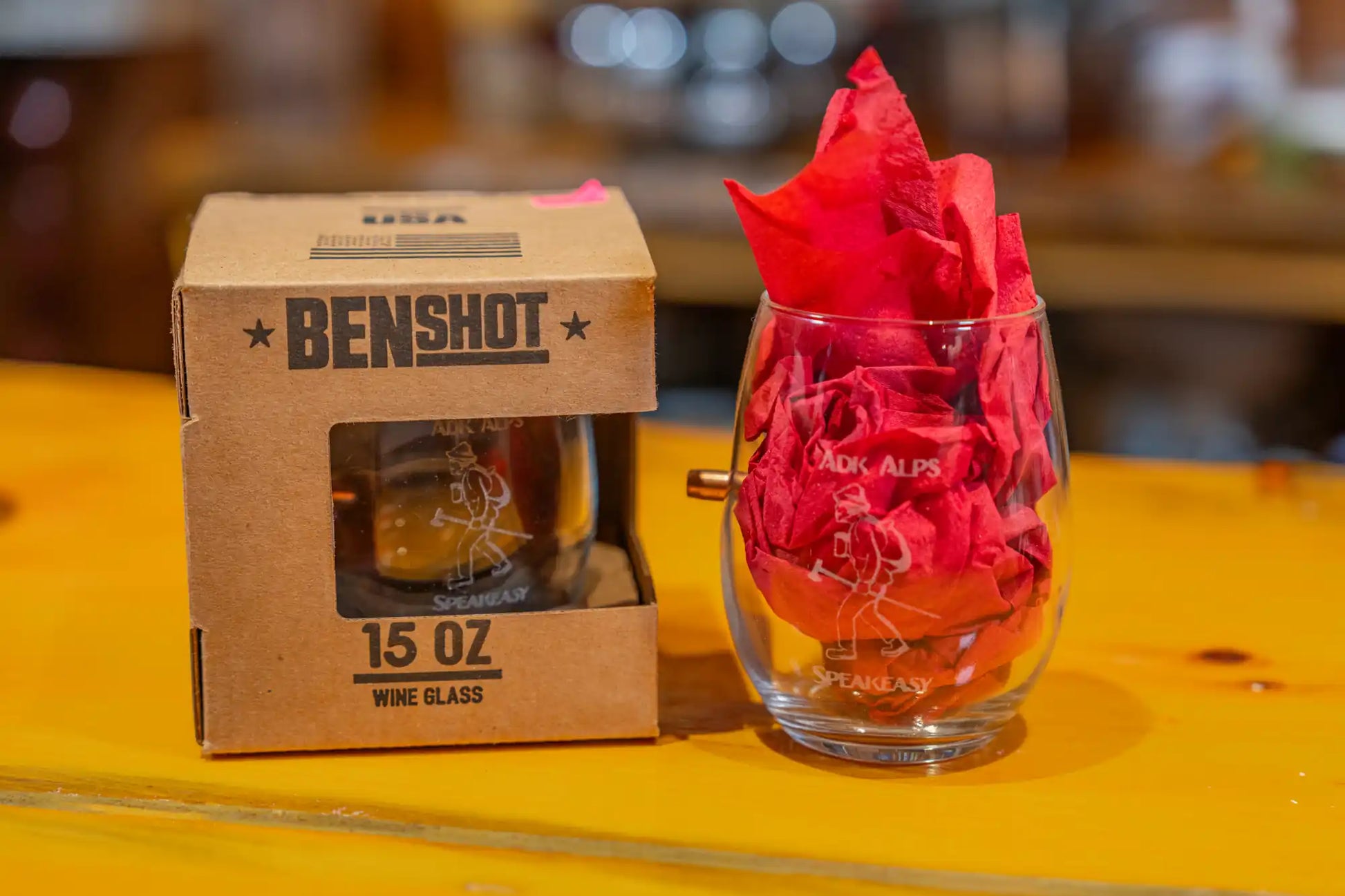 A stemless, 15 oz wine glass embedded with a real, lead-free, solid copper bullet. Plus, they're laser engraved with our "Adk Alps Speakeasy" logo!